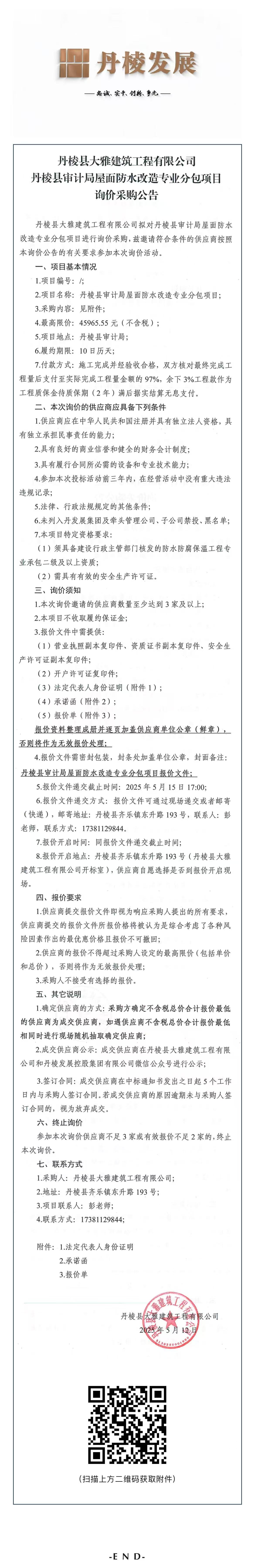 丹棱縣大雅建筑工程有限公司丹棱縣審計局屋面防水改造專業(yè)分包項目詢價采購公告