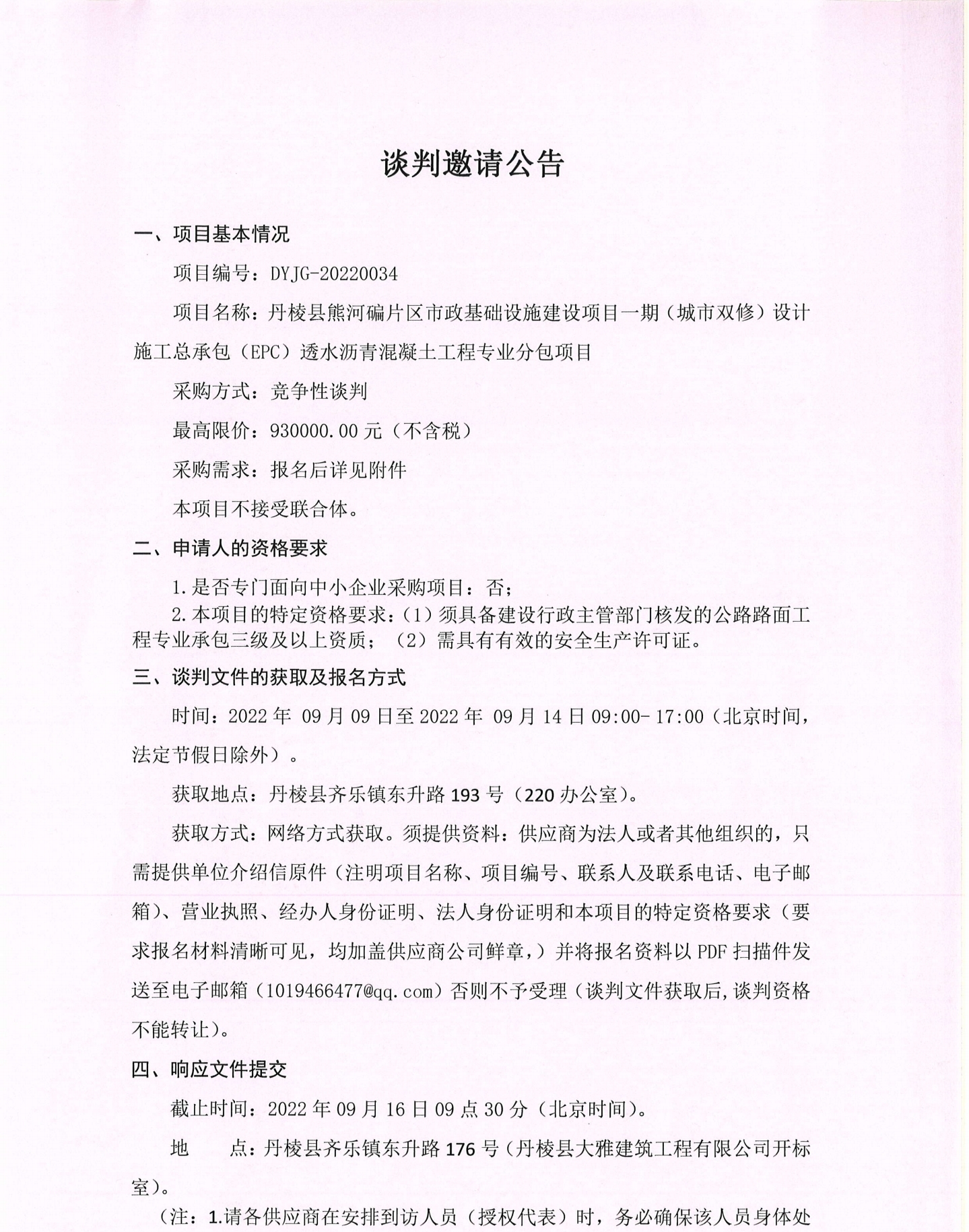 丹棱縣熊河碥片區(qū)市政基礎(chǔ)設(shè)施建設(shè)項目一期(城市雙修)設(shè)計施工總承包(EPC)透水瀝青混凝土工程專業(yè)分包項目談判邀請公告
