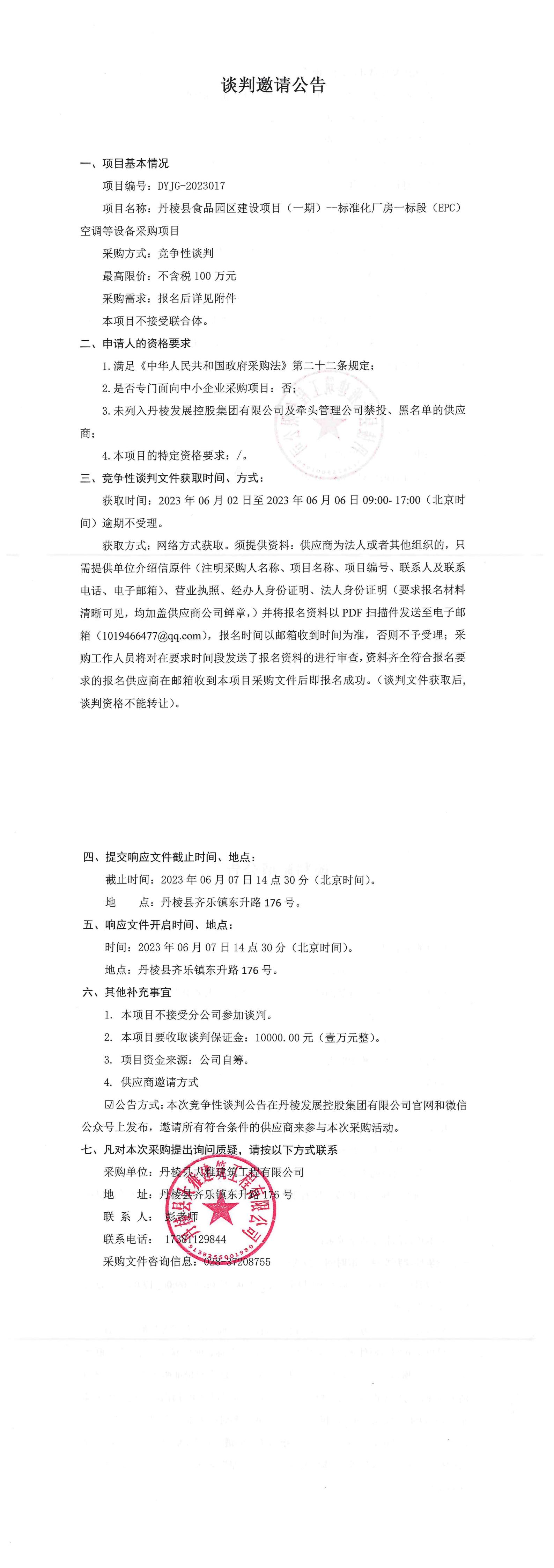 丹棱縣食品園區(qū)建設(shè)項(xiàng)目(一期)--標(biāo)準(zhǔn)化廠房一標(biāo)段(EPC)空調(diào)等設(shè)備采購(gòu)項(xiàng)目談判邀請(qǐng)公告