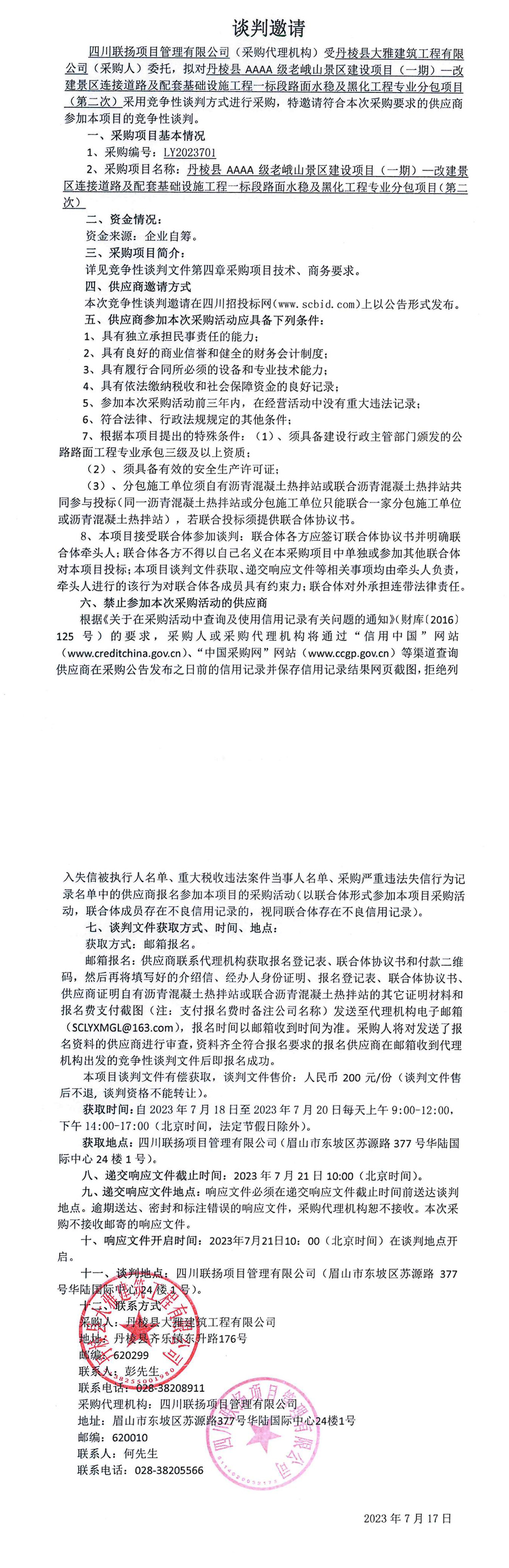 丹棱縣AAAA級(jí)老峨山景區(qū)建設(shè)項(xiàng)目(一期)—改建景區(qū)連接道路及配套基礎(chǔ)設(shè)施工程一標(biāo)段水穩(wěn)及黑化工程專業(yè)分包談判邀請(qǐng)公告(第二次)