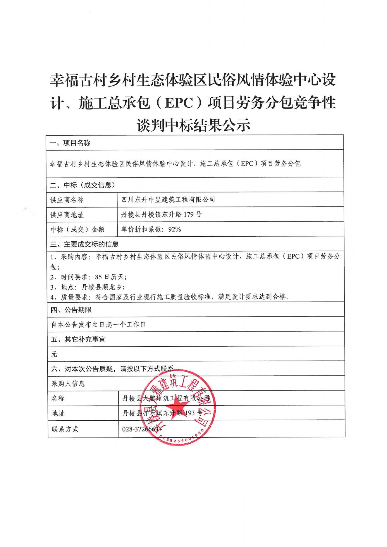 【大雅建筑公司】幸福古村鄉(xiāng)村生態(tài)體驗區(qū)民俗風情體驗中心設(shè)計、施工總承包(EPC)項目勞務(wù)分包競爭性談判中標結(jié)果公示