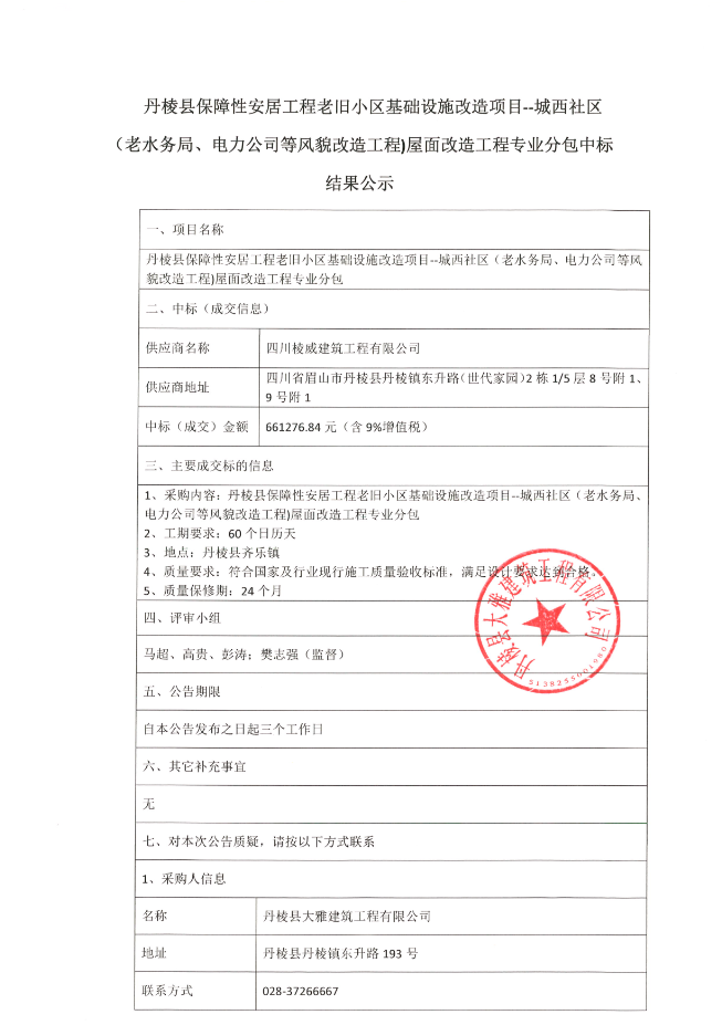 【大雅建筑公司】丹棱縣保障性安居工程老舊小區(qū)基礎(chǔ)設(shè)施改造項目--城西社區(qū)(老水務(wù)局、電力公司等風(fēng)貌改造工程)屋面改造工程專業(yè)分包中標結(jié)果公示