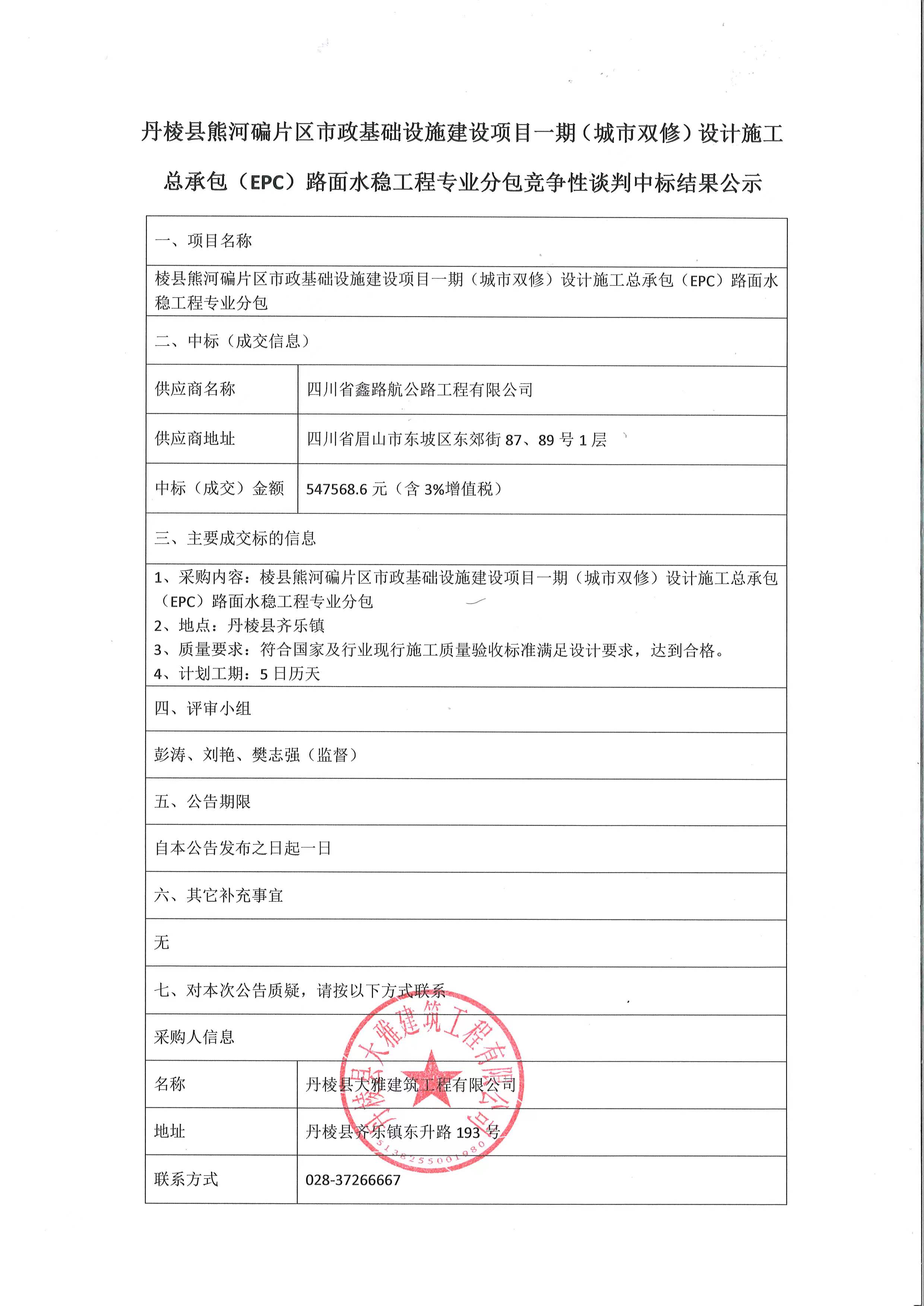 丹棱縣熊河碥片區(qū)市政基礎(chǔ)設(shè)施建設(shè)項目一期(城市雙修)設(shè)計施工總承包(EPC)路面水穩(wěn)工程專業(yè)分包競爭性談判中標(biāo)結(jié)果公示