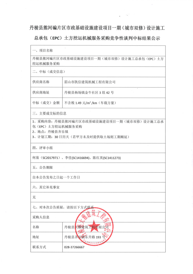 丹棱縣熊河碥片區(qū)市政基礎(chǔ)設(shè)施建設(shè)項目一期(城市雙修)設(shè)計施工 總承包(EPC)土方挖運(yùn)機(jī)械服務(wù)采購競爭性談判中標(biāo)結(jié)果公示