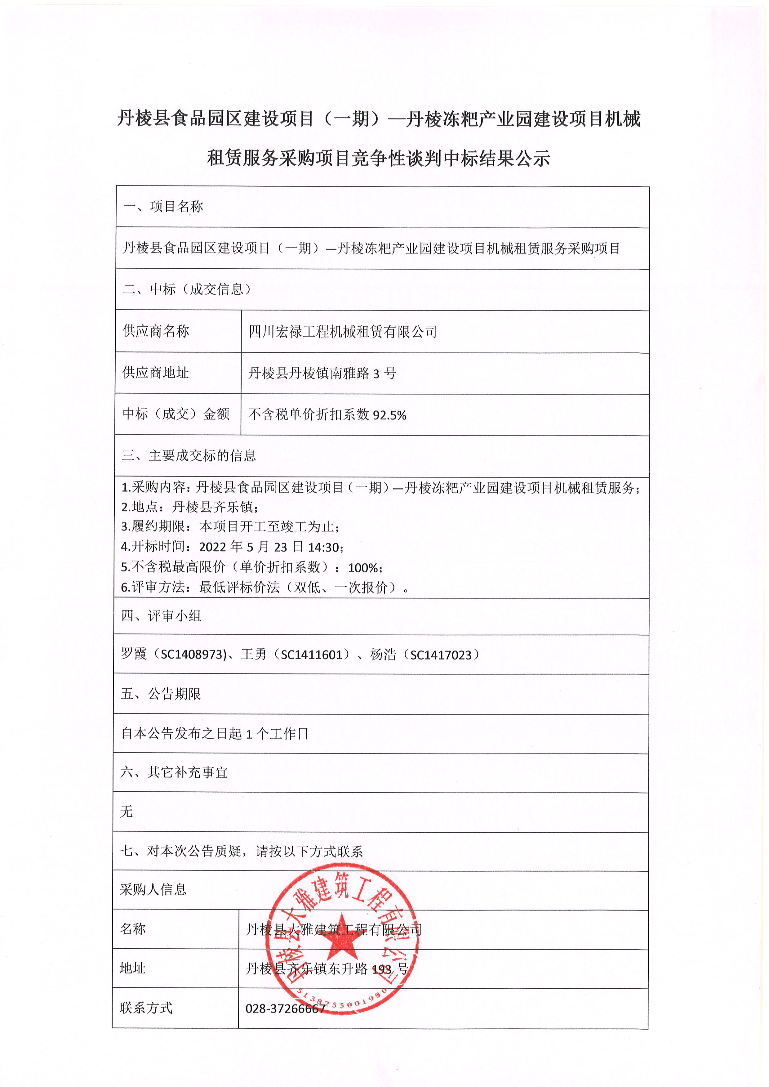 丹棱縣食品園區(qū)建設(shè)項(xiàng)目(一期)-丹棱凍粑產(chǎn)業(yè)園建設(shè)項(xiàng)目機(jī)械 租賃服務(wù)采購(gòu)項(xiàng)目競(jìng)爭(zhēng)性談判中標(biāo)結(jié)果公示