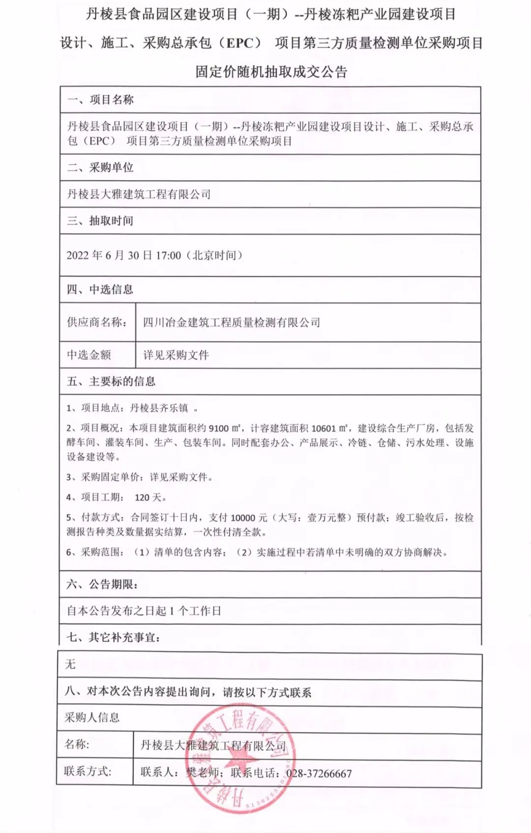 丹棱凍粑產業(yè)園建設項目設計、施工、采購總承包(EPC)項目第三方質量檢測單位采購項目固定價隨機抽取成交公告
