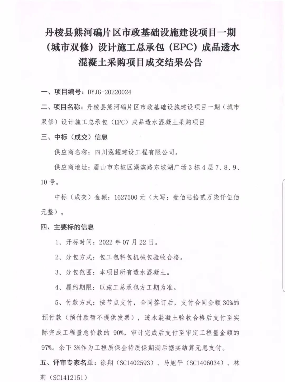 丹棱縣熊河碥片區(qū)市政基礎設施建設項目一期(城市雙修)設計施工總承包(EPC)成品透水混凝土采購項目成交結果公告