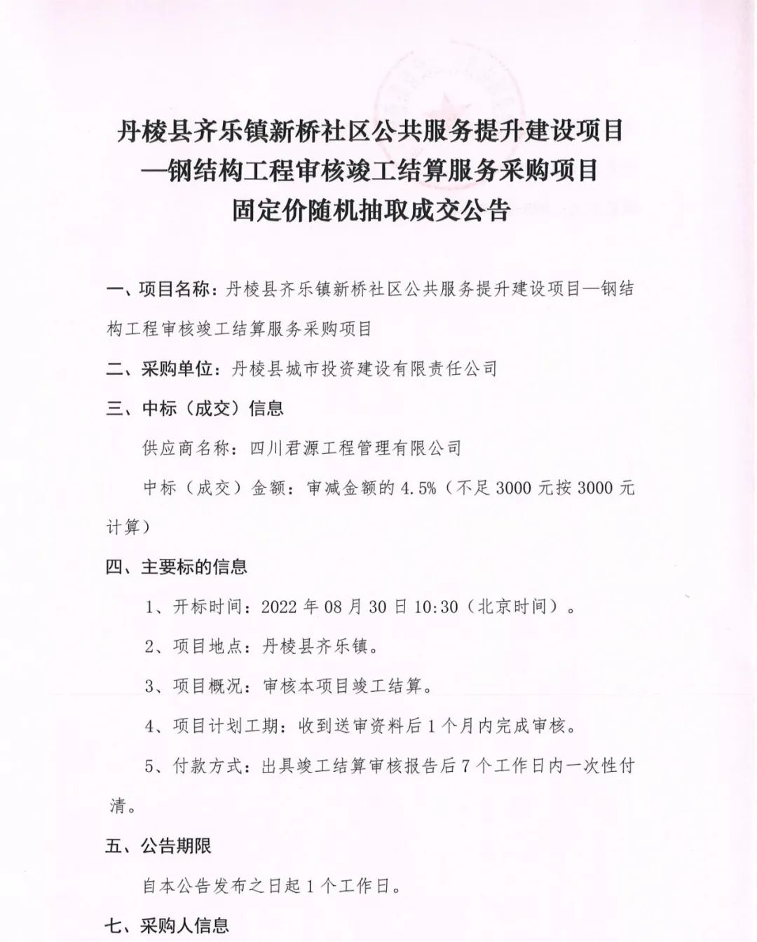 丹棱縣齊樂鎮(zhèn)新橋社區(qū)公共服務(wù)提升建設(shè)項(xiàng)目--鋼結(jié)構(gòu)工程審核竣工結(jié)算服務(wù)采購(gòu)項(xiàng)目固定價(jià)隨機(jī)抽取成交公告