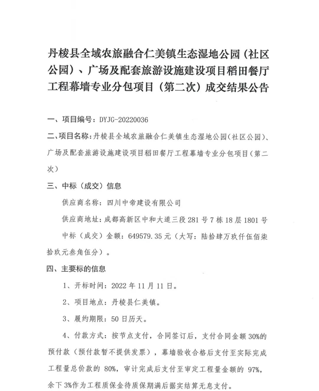 丹棱縣全域農旅融合仁美鎮(zhèn)生態(tài)濕地公園(社區(qū)公園)、廣場及配套旅游設施建設項目稻田餐廳工程幕墻專業(yè)分包(第二次)成交結果公告