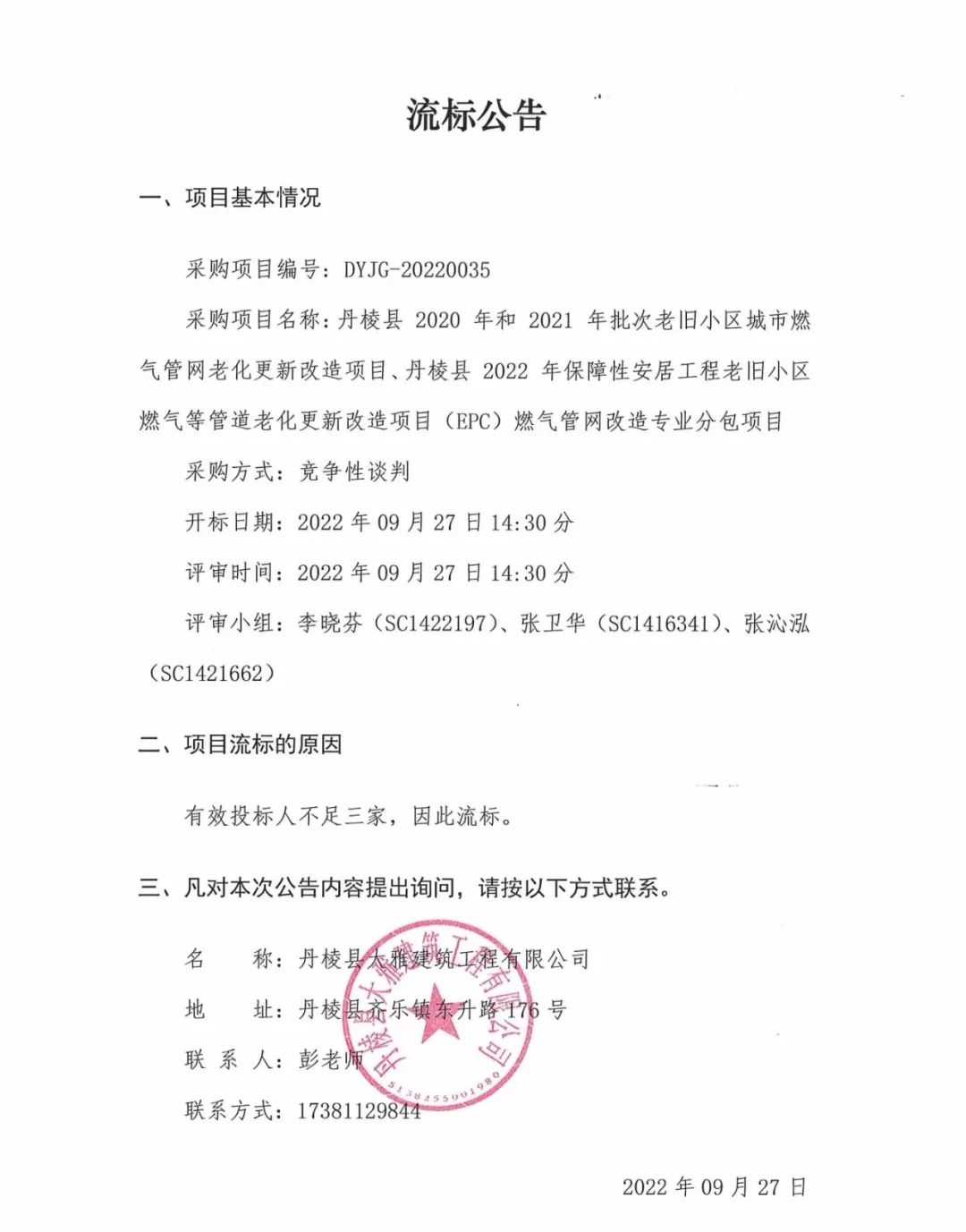 丹棱縣 2020 年、2021年及2022年批次老舊小區(qū)城市燃?xì)夤芫W(wǎng)老化更新改造項(xiàng)目燃?xì)夤芫W(wǎng)改造專(zhuān)業(yè)分包項(xiàng)目流標(biāo)公告