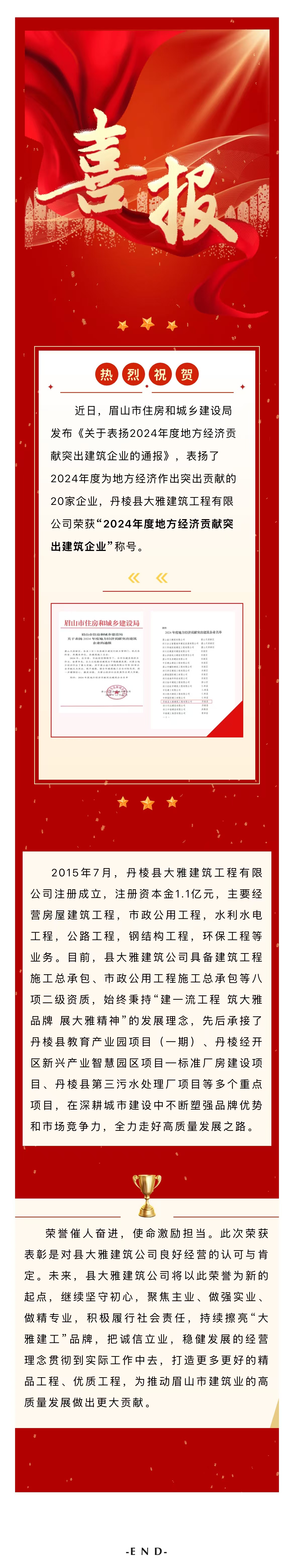 【縣大雅建筑公司】喜報!榮獲全市2024年度地方經(jīng)濟貢獻突出建筑企業(yè)