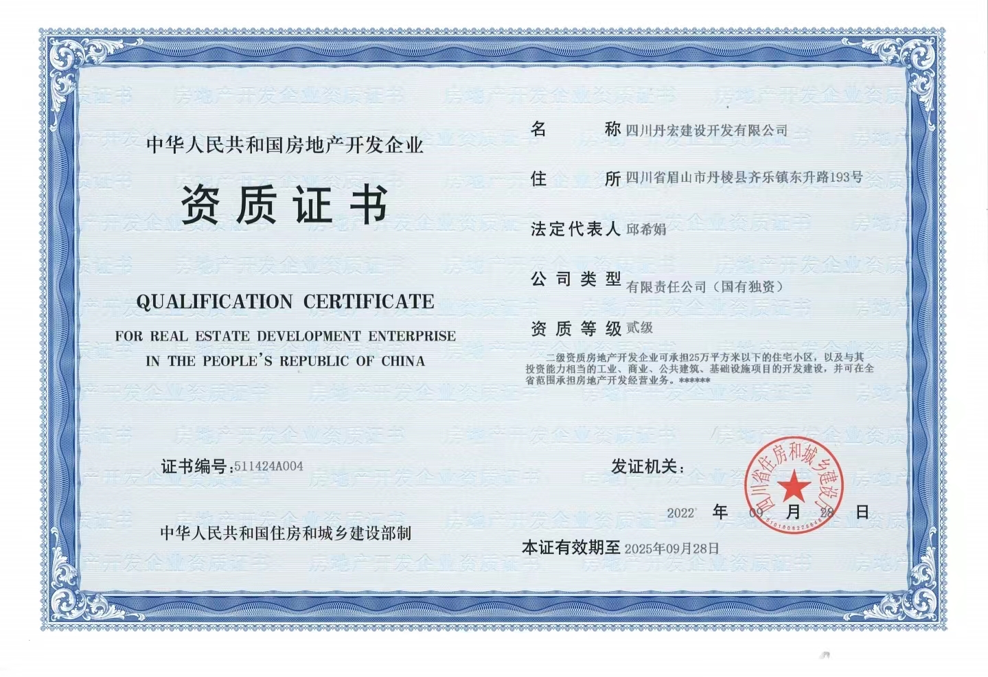近日,丹發(fā)展集團下屬的四川丹宏建設(shè)開發(fā)有限公司順利通過了四川省住房和城鄉(xiāng)建設(shè)廳資格審核,成功獲取了房地產(chǎn)開發(fā)二級資質(zhì)。標(biāo)志著丹宏公司可承擔(dān)建筑面積25萬平方米以下項目的開發(fā)建設(shè),并可在全省范圍承擔(dān)房地產(chǎn)開發(fā)經(jīng)營業(yè)務(wù),為進(jìn)一步擴大建設(shè)規(guī)模及開發(fā)區(qū)域奠定了堅實基礎(chǔ)。