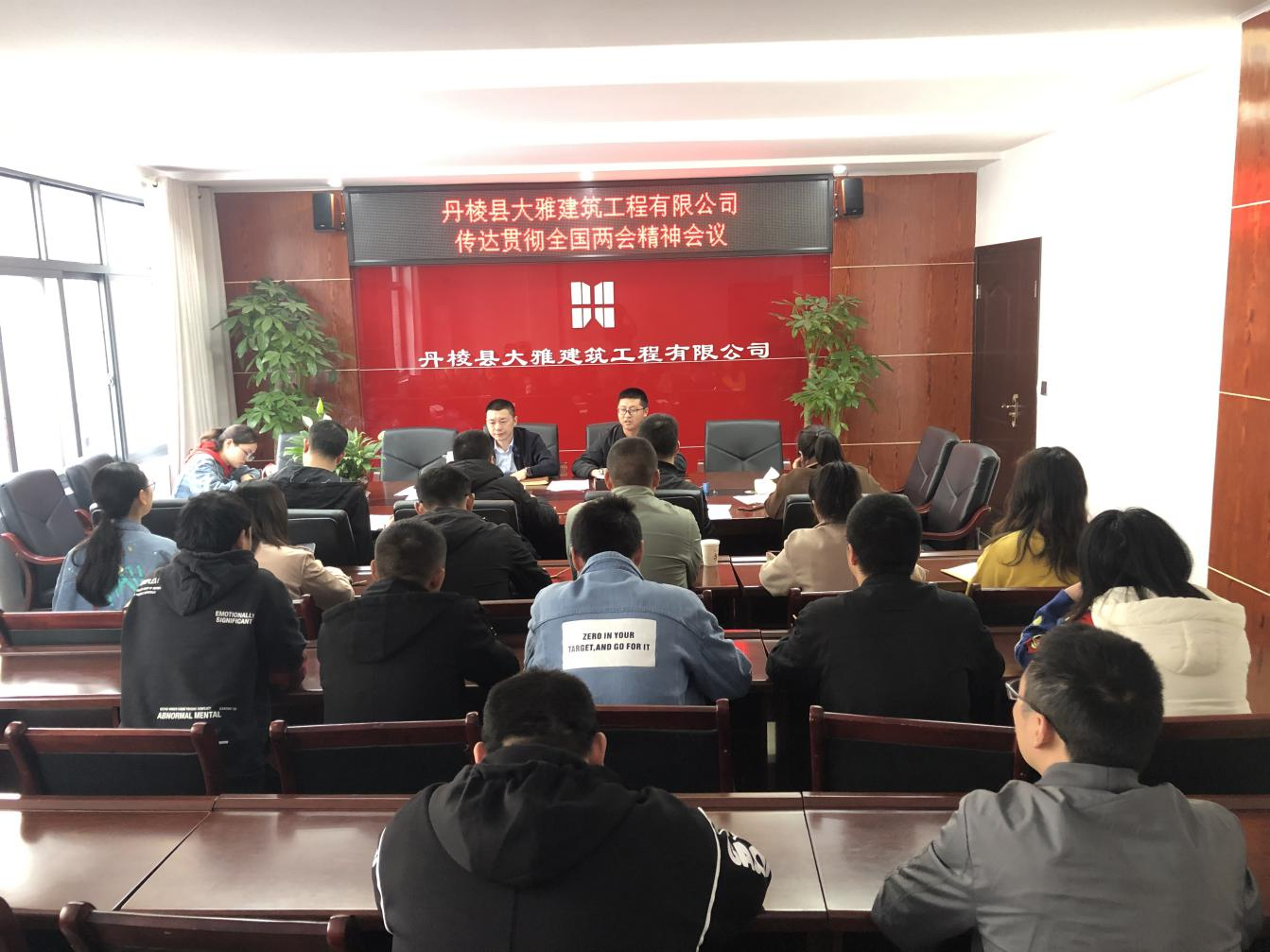 近日丹棱縣大雅建筑工程有限公司召開傳達貫徹全國兩會精神會議,公司董事長主持會議,全體黨員和干部職工參加。